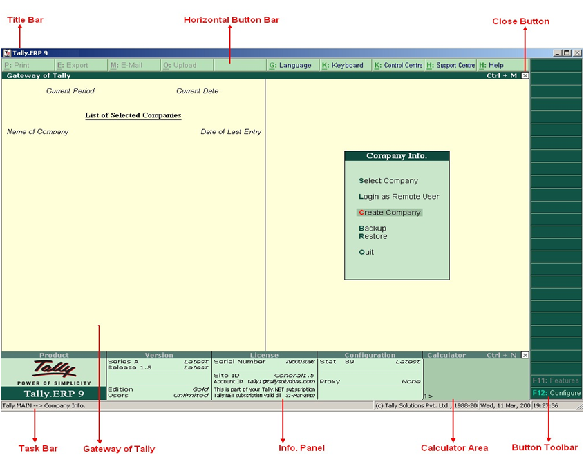Screen के ऊपर Title Bar होता है, जिसमें Company का नाम और Tally Version दिखाई देता है। - Buttons Toolbar